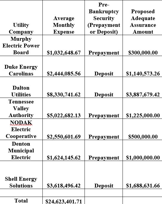 However, recent volatility in the cryptocurrency markets[1] has forced some cryptocurrency brokers/miners into bankruptcy, and these filings highlight the credit risk that utilities face when a significant customer ceases operations or files bankruptcy. For example, Core Scientific, Inc. and related companies (“Core”) – recently filed a Chapter 11 bankruptcy. As part of its bankruptcy filings, Core stated that its total average monthly bill for electricity was more than $24 million dollars split between seven providers. Prior to the bankruptcy, Core had either posted deposits with its providers or was pre-paying for the following week’s estimated usage. The table below was copied from a pleading in the case.
